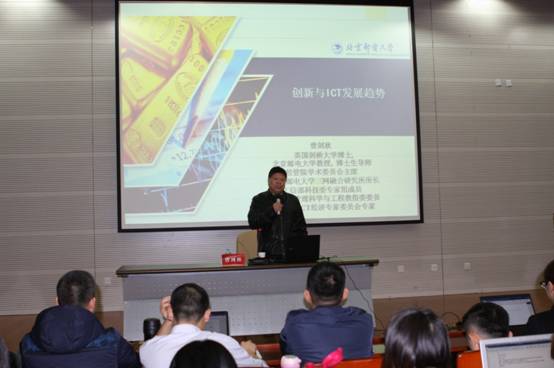 2018年3月21日晚,《坚持新发展理念的基本方略》由北京邮电大学曾剑秋教授以《创新与ICT发展趋势》为题顺利开讲,公司best365足球官网谢玉进老师担任主持。曾剑秋教授是英国剑桥大学博士,现任北京邮电大学经济管理公司教授、博士生导师,三网融合研究所所长,信息经济与竞争力研究中心主任,工业和信息化部科技委专家组成员,教育部管理科学与工程教指委委员,工业和信息化部ICT经济专家委员会委员,北京邮电大学经济管理公司学术委员会主席。在ICT产业政策与市场、企业竞争力、网络融合、5G技术演进、大数据、人工智能、物联网等方面有深入的研究与独到见解。曾教授的授课注重互动,以同学们关心的问题开场,紧密结合“创新”这一主题词,深入浅出地结合我国信息技术的发展诠释了什么叫创新和如何创新等基本问题。曾教授的讲授紧贴时政热点和员工关注点,深刻梳理了2018年政府工作报告和党的十九大报告关于创新的相关论述,对“互联网+”行动计划、“国家大数据战略”“网络强国”等国家战略和部署,进而从创新与智慧社会、国家创新体系建设、智慧社会与智慧城市、宽带中国与信息消费、信息化政策与ICT市场开放、大数据、人工智能与实体经济等方面对我国当前的信息化战略落实、网络强国建设、宽带、数字经济与5G技术、大数据、人工智能和物联网发展及前景进行了详尽的讲解。曾教授的讲授平实而有力、质朴而前沿,深入浅出,娓娓道来,极大地开拓了在场师生的视野,深化了对科技创新的认识和理解。谢玉进老师用“内行、前沿、高端”六个关键词对曾教授的精彩讲授进行了点评,认为曾教授用非常有限的时间系统地清晰明快地梳理了我国复杂的信息化进程,带领同学们很好地领略了ICT发展最前沿的技术风采和社会可能性,带给大家一种高端的资讯冲击和深刻的创新思考,很好地诠释了什么是创新,并内含着如何创新的方法论,对同学们理解创新发展理念有着极大的帮助。200余名同学现场聆听了授课,反响十分热烈。