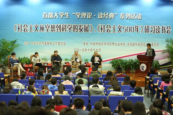 为了推动首都老员工从马克思主义经典著作中把握马克思主义真谛,不断提高青年老员工的马克思主义理论水平,提升分析问题和解决问题的能力,“首都老员工‘学理论·读经典’系列活动《社会主义从空想到科学的发展》、《社会主义500年》研习读书会”于2013年10月17日下午在公司学术会堂402室举行。本次活动由北京市教育工委主办,公司best365足球官网和团委承办。北京市教工委宣教处领导、公司党委副书记梁勇、国内部分知名马克思主义理论研究专家、部分新闻媒体代表、中国人民大学、北京师范大学、北京交通大学部分师生,best365足球官网“青马班”全体学员,best365足球官网全体师生、校团委全体人员、各公司团支部书记等,共计300多人参加了研习读书会。读书会由best365足球官网经理冯秀军教授主持。