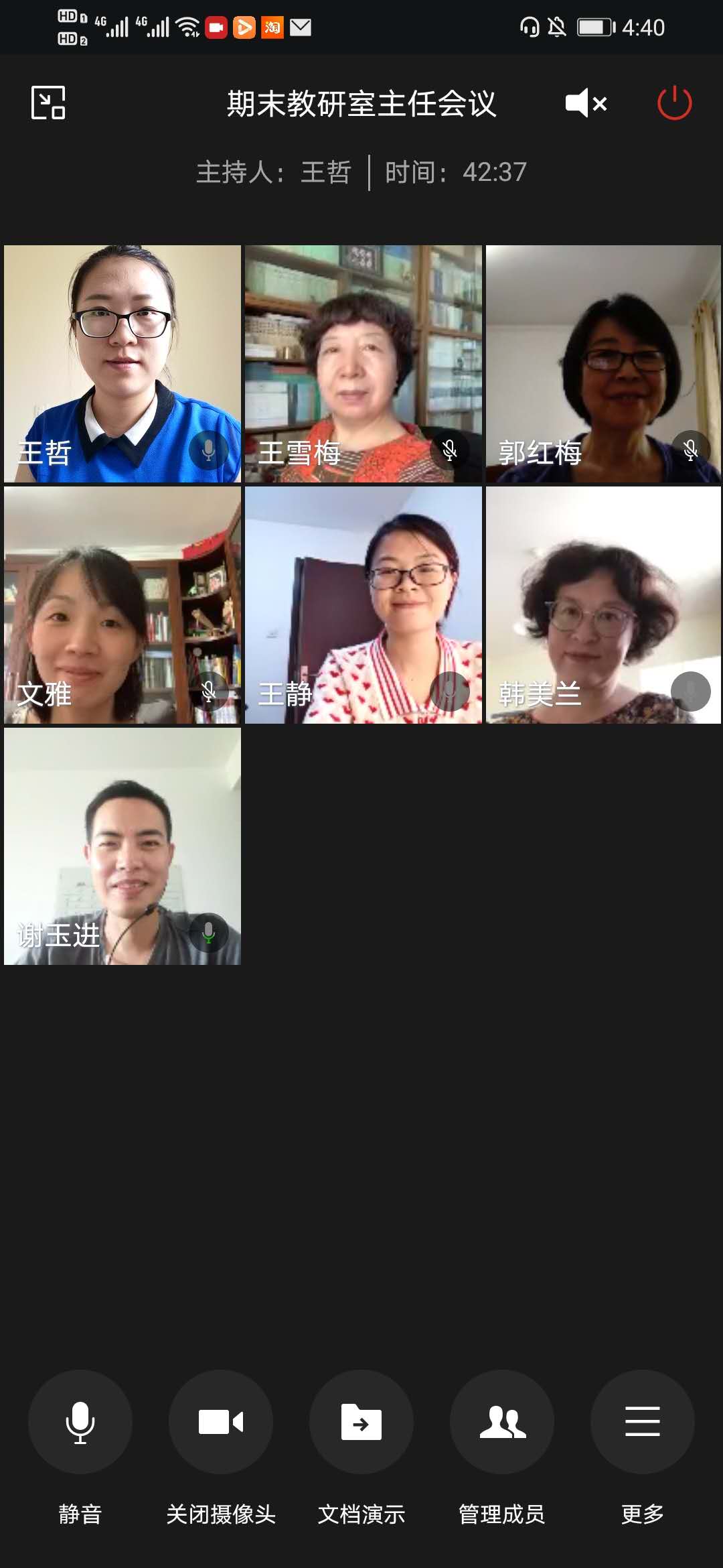 7月15日,best365足球官网采用企业微信在线召开2019-2020学年第二学期期末教研室主任会议。会议由公司教学副经理谢玉进副教授主持,中国近现代史纲要教研室主任王雪梅教授、毛泽东思想和中国特色社会主义理论体系概论教研室主任郭红梅教授、马克思主义基本原理教研室主任韩美兰教授、思想道德修养与法律基础教研室主任文雅副教授、形势与政策教研室主任王静副教授、公司教学科研办公室主任王哲参加了会议。