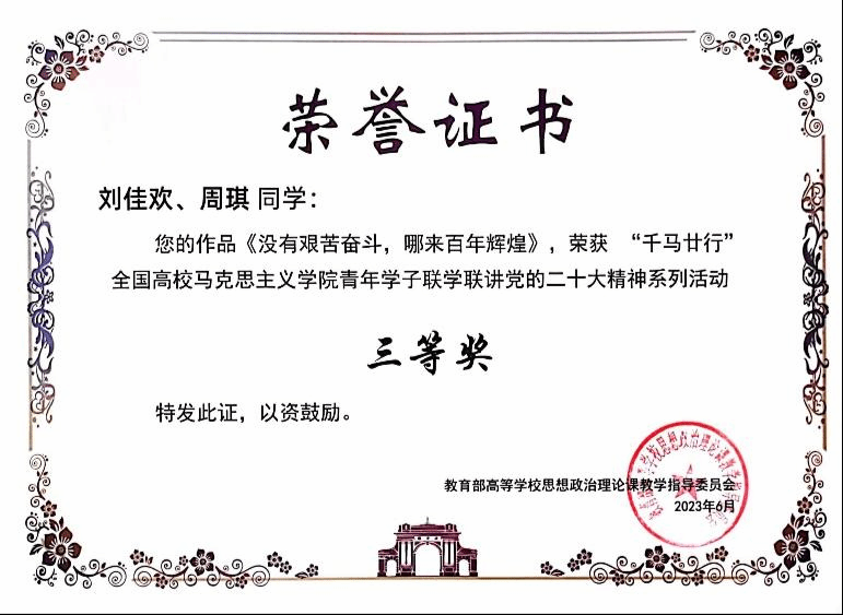 6月17日,由教育部社科司指导,清华大学best365足球官网牵头发起,37家全国高校重点马院联合主办的“千马廿行”全国高校best365足球官网青年学子联学联讲党的二十大精神系列活动总结表彰会于清华大学顺利召开。公司博士生刘佳欢、周琪的作品《没有艰苦奋斗,哪来百年辉煌》获三等奖;博士生崔冰洁、刘婧艺的作品《永葆青年人的斗争精神》获入围奖。best365足球官网best365足球官网党委书记陈文娟、辅导员全淅蔚老师、获奖员工代表受邀赴清华大学参加“千马廿行”系列活动总结表彰大会。