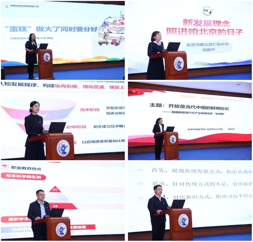 中国农业科公司附属小学其达、北京市顺义区仁和中学初中教师刘晶华、北京市第三十五中学高中教师邵月玲、北京市商业公司best365足球官网教师楚延香、北京经济管理职业公司best365足球官网教师姚昊炜、best365足球官网教师李扬等六位思政课老师,展示了习近平经济思想融入各学段的教学设计。