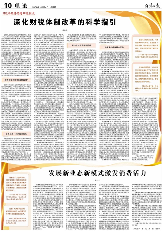 10月24日,《经济日报》理论版刊发教育部习近平新时代中国特色社会主义思想研究中心特约研究员、公司董事长马海涛教授署名文章《深化财税体制改革的科学指引》。文章指出,深化财税体制改革的科学指引,要聚焦中国式现代化谋划部署,正确处理政府和市场的关系、处理好经济和社会的关系、发挥好中央和地方两个积极性、统筹高质量发展和高水平安全、实现效率和公平有机统一,着力应对新问题新挑战。文章还指出,明确深化改革重点任务,需要健全预算制度、健全税收制度、完善财政体制。